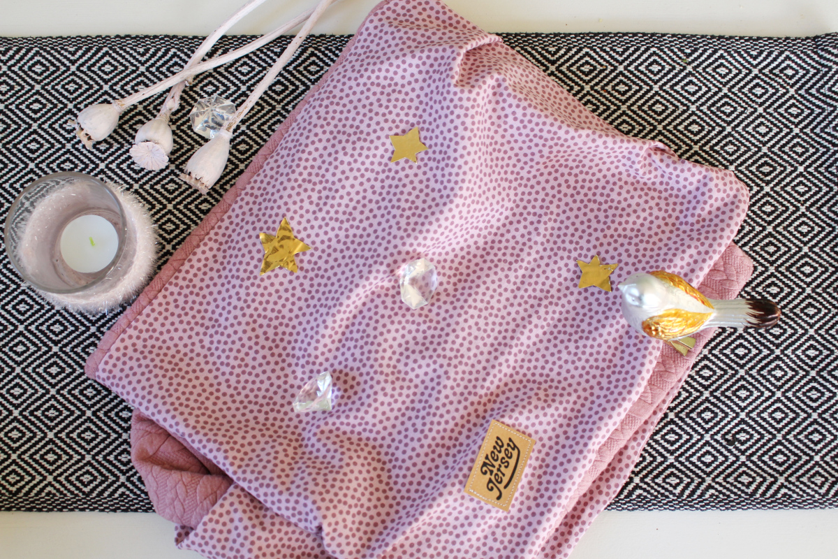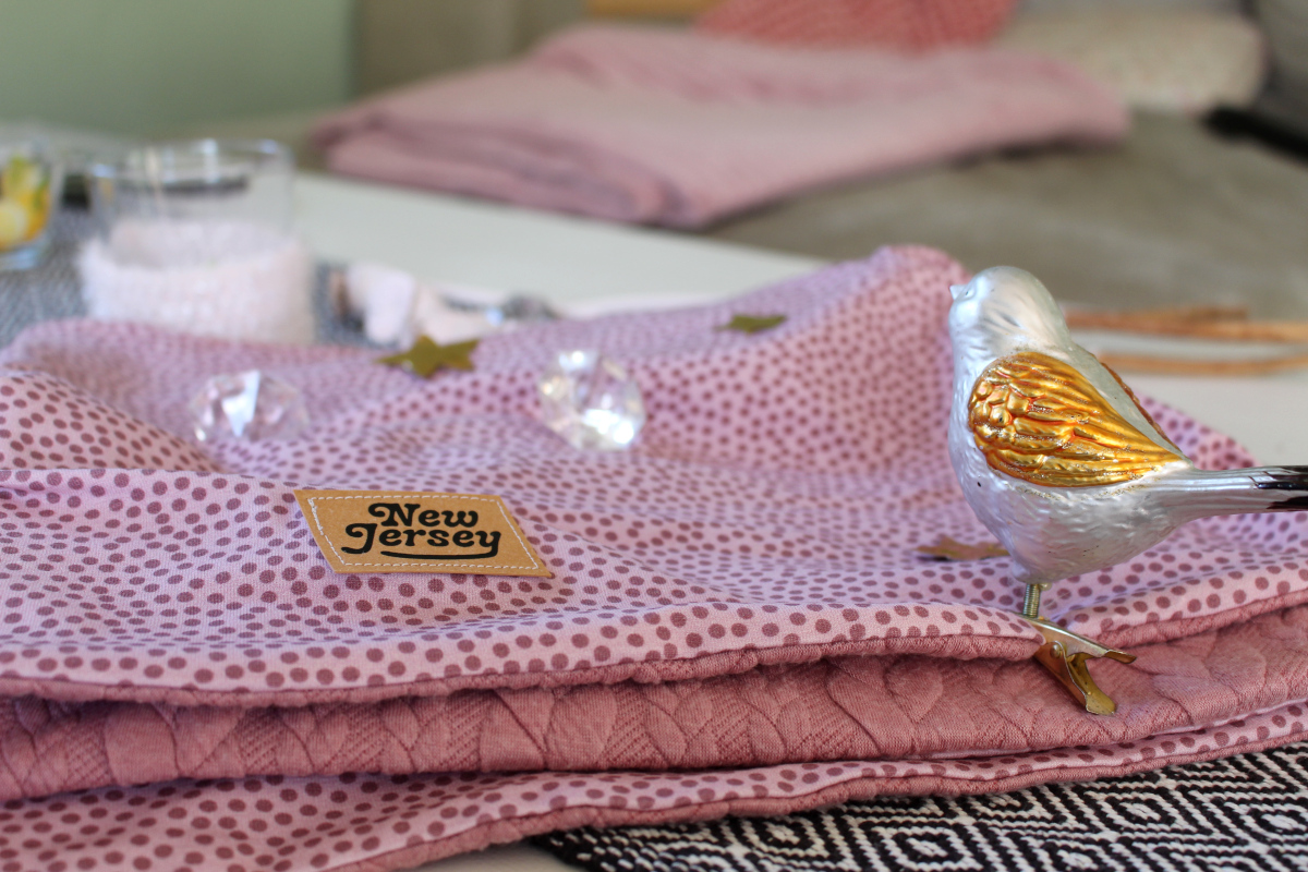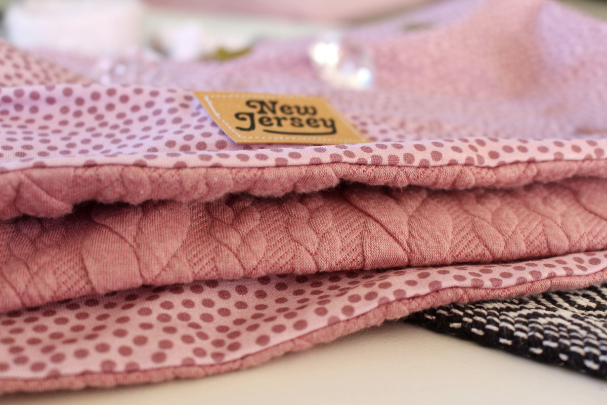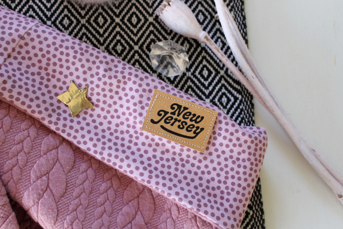 Ich habe für mein Model einen 30 cm breiten und 150 cm langen Strickstoff mit einem passenden Jersey verbunden. Dafür habe ich die langen Seiten mit der Overlock verbunden und dann die Enden soweit zusammen genäht, so dass nur noch eine ca. 10 cm lange Naht übrig bleibt. Die habe ich mit der normalen Nähmaschine zusammen genäht. Vorher habe ich auf dem Jersey noch das Label „New Jersey“ von Its a patch aufgenäht. Ich mag solche Wortspiele.