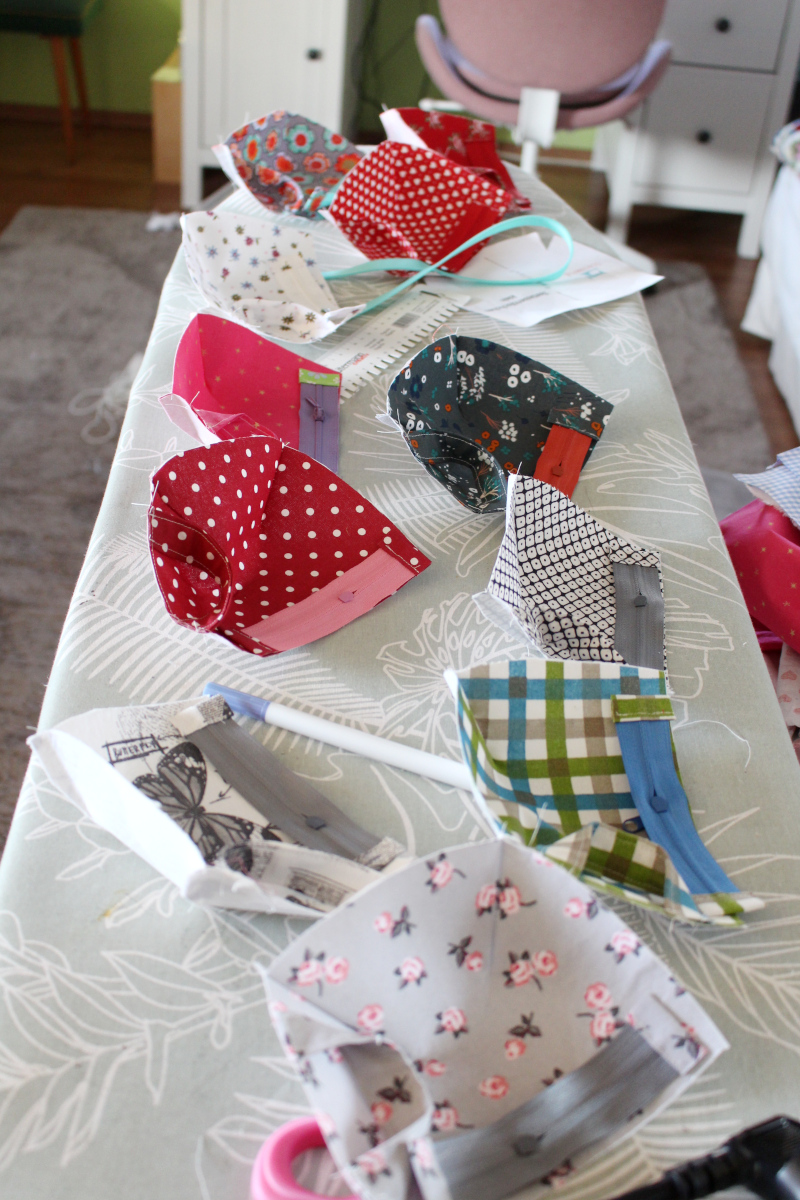 Eigentlich hatte ich überlegt, etwas aus Jeans zu machen, aber dann habe ich die süßen Täschchen von SewSimple entdeckt – und wusste sofort: Die sind es! Allerdings war ich kurz unsicher, ob ich es überhaupt noch schaffe, zehn Stück zu nähen. Also habe ich mir eine kleine Nähstrategie überlegt. Das Wochenende nutzte ich, um alle Schnittteile auszuschneiden und auf die Verstärkung Vlieseline H250 zu bügeln.