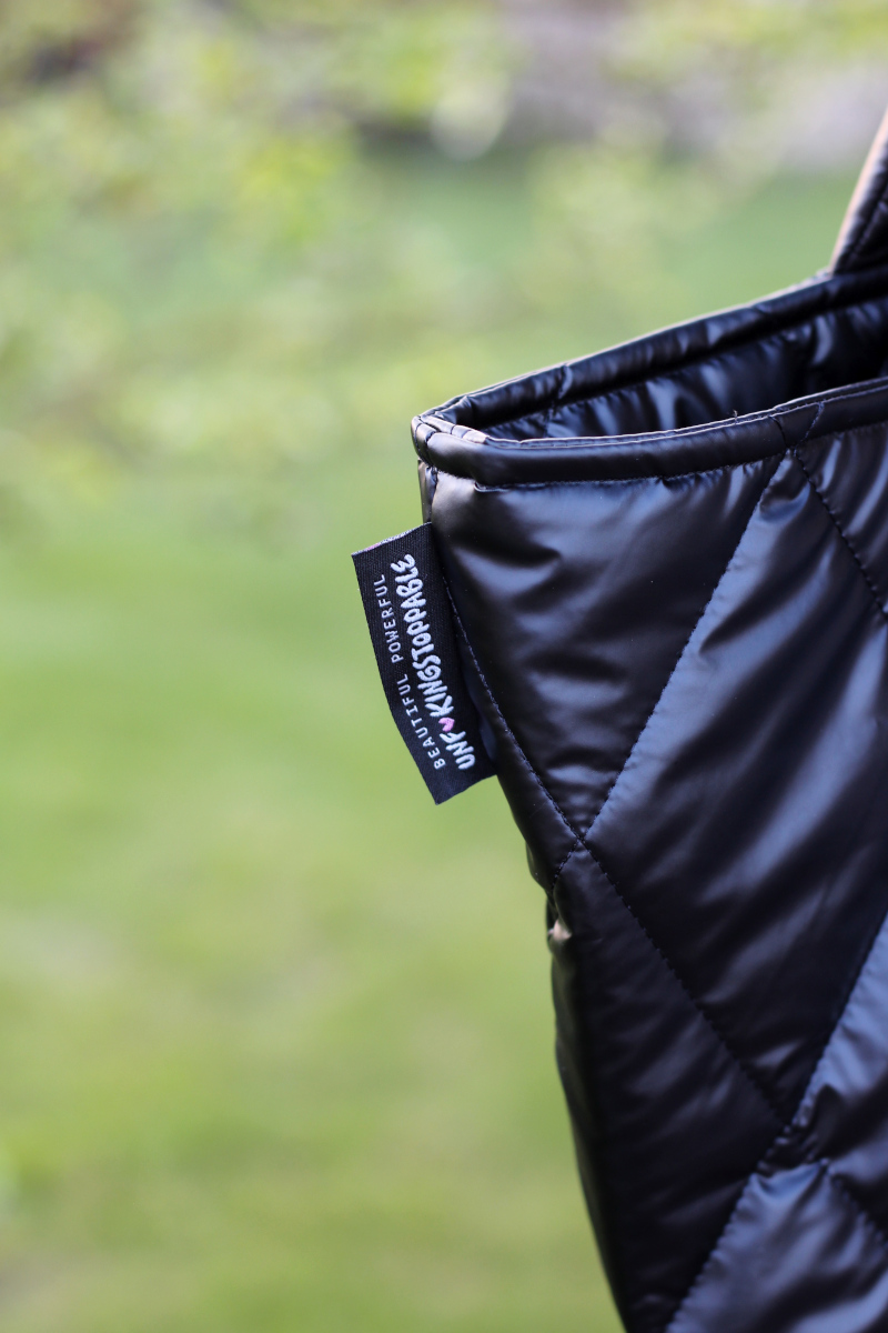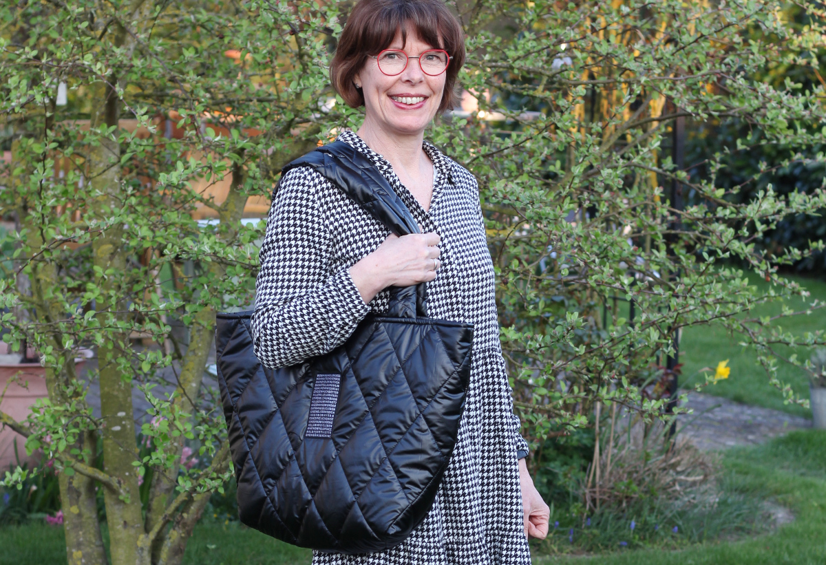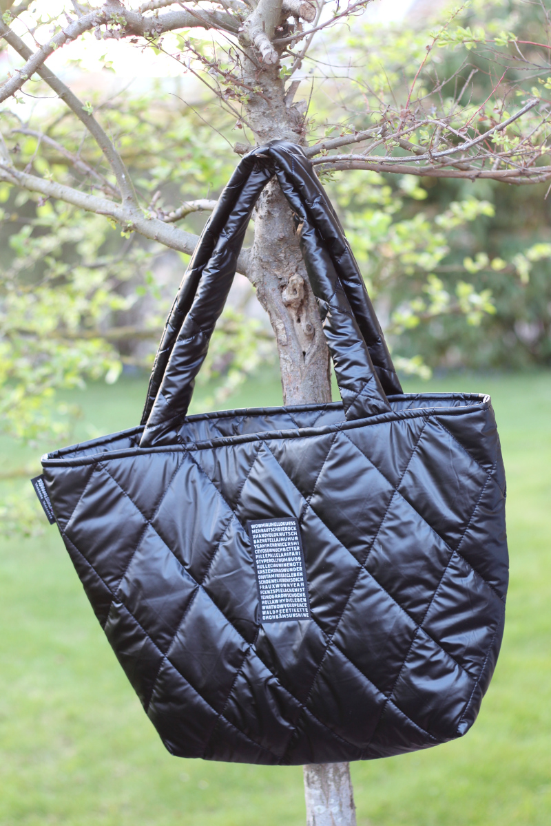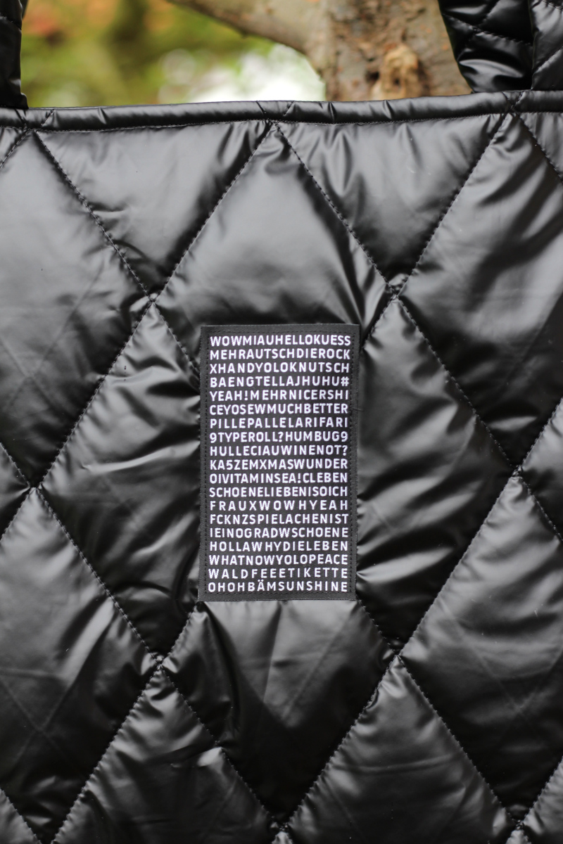 Schnittmuster runtergeladen – danke an Stoffe Hemmers für die tolle Gratis-Anleitung – und los ging’s. Als Stoff habe ich bei Lenipepunkt ein wunderschönes Steppmaterial gefunden. Eigentlich wollte ich upcyceln und einem alten Steppmantel neues Leben einhauchen, aber hey – Geburtstagsgeschenke dürfen auch mal neu und glänzend sein. Mit einem Ettikette von @mehrettikette bekam die Außenseite noch ein wenig was zu lesen. Ich mag dieses Wortspielettikett, wo man seine Lieblingswörter anmarkern kann. Ein Seitenlabel von Lenipepunkt machte die Tasche von außen komplett.