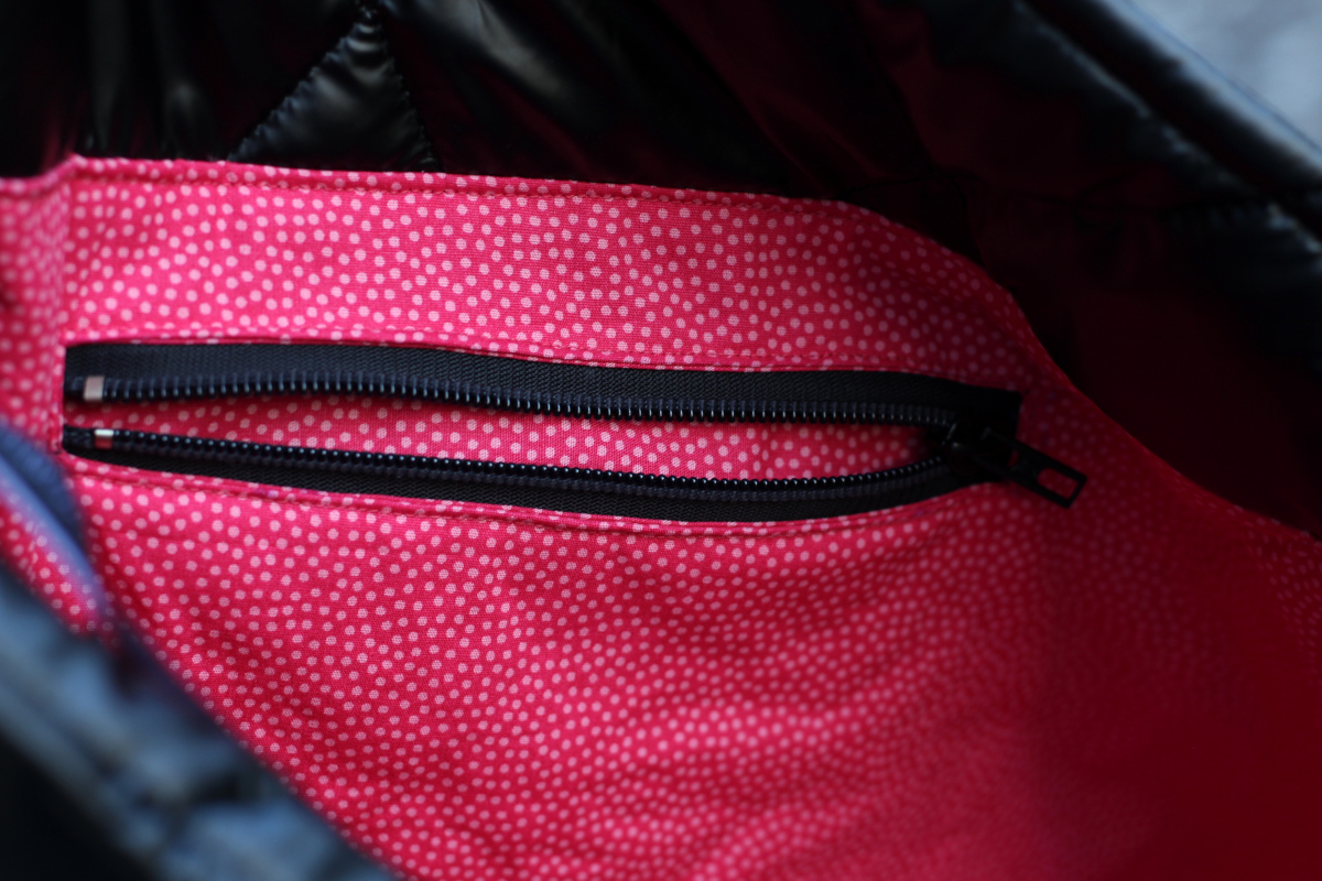 Innen habe ich übrigens nicht mit Schwarz gearbeitet – auch wenn meine Kollegin Schwarz liebt. Aber Hand aufs Herz: Wer schon mal eine schwarze Tasche mit schwarzem Futter hatte, weiß, dass das in etwa so praktisch ist wie Radfahren im Dunkeln. Ich habe mich also für ein knalliges Pink entschieden – kontrastreich, fröhlich und vor allem: man findet endlich wieder seine Kaugummis!