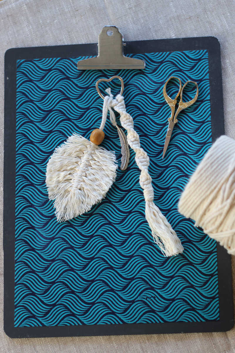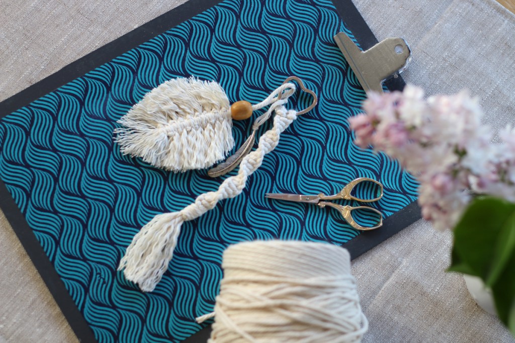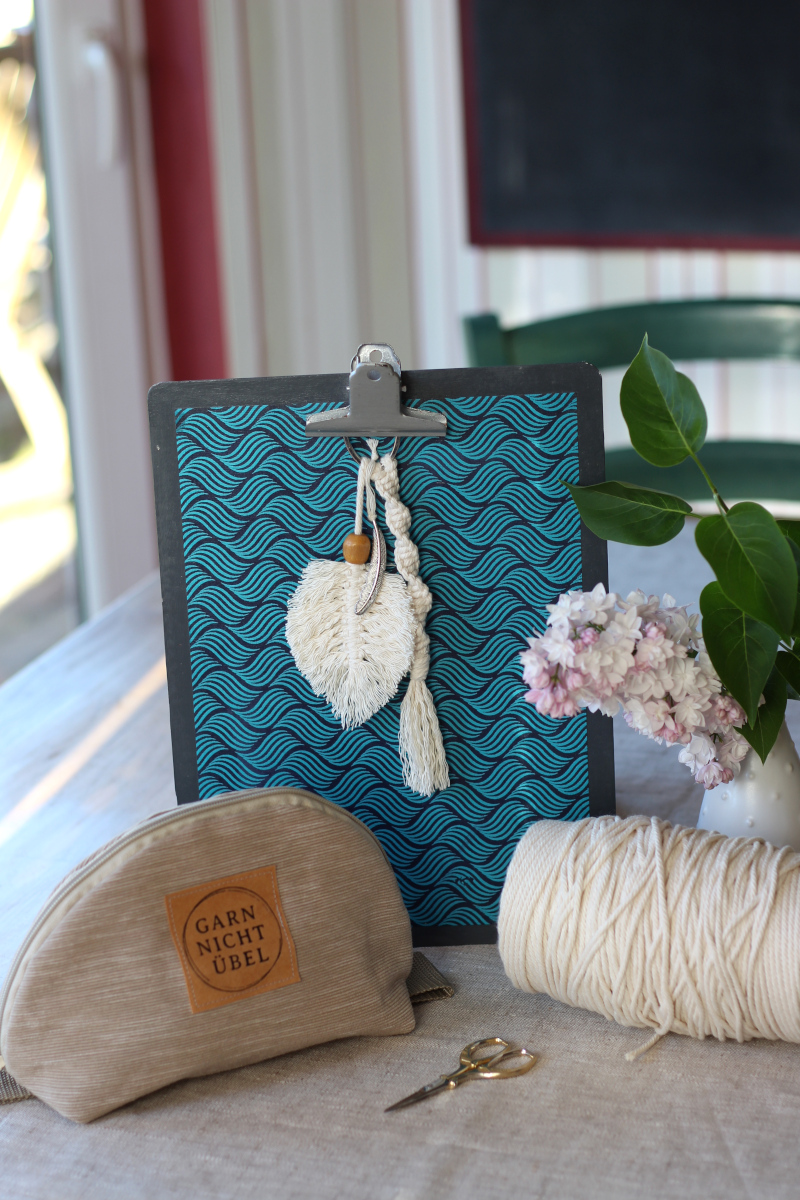 Jetzt muss ich gestehen: Ich habe eine ausgeprägte Links-Rechts-Schwäche – das macht das Knüpfen nicht gerade einfacher. Rechter Faden unter die beiden mittleren, dann über den linken drüber, durchziehen, dann alles nochmal andersrum … puh! Aber mit ein bisschen Übung und der Hilfe vom großartigen Klemmbrett von von Karin habe ich’s geschafft. Makramee-Profis würden wahrscheinlich müde lächeln, aber ich bin ehrlich gesagt ein bisschen stolz auf mein Werk: eine Kordel mit Feder, aufgepeppt mit einem kleinen Charm. Und – tadaaa – sehr unbunt, aber gar nicht übel!