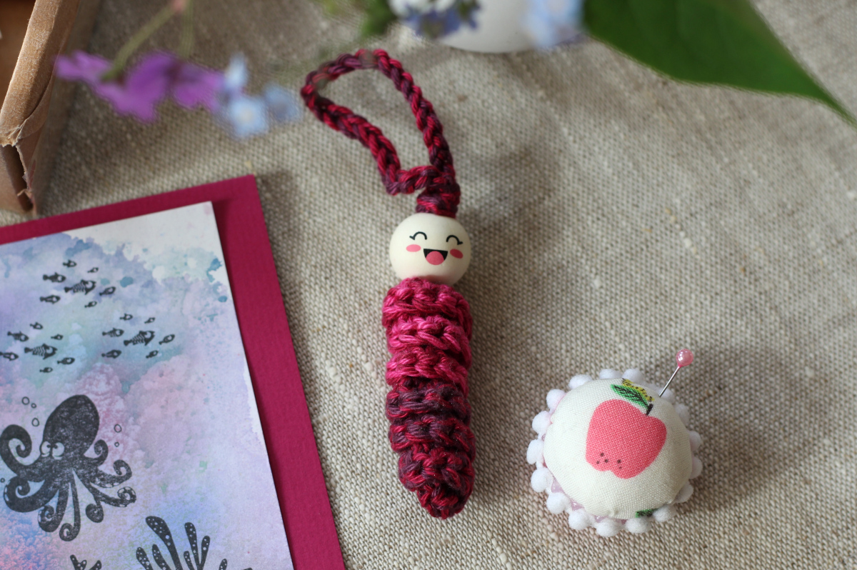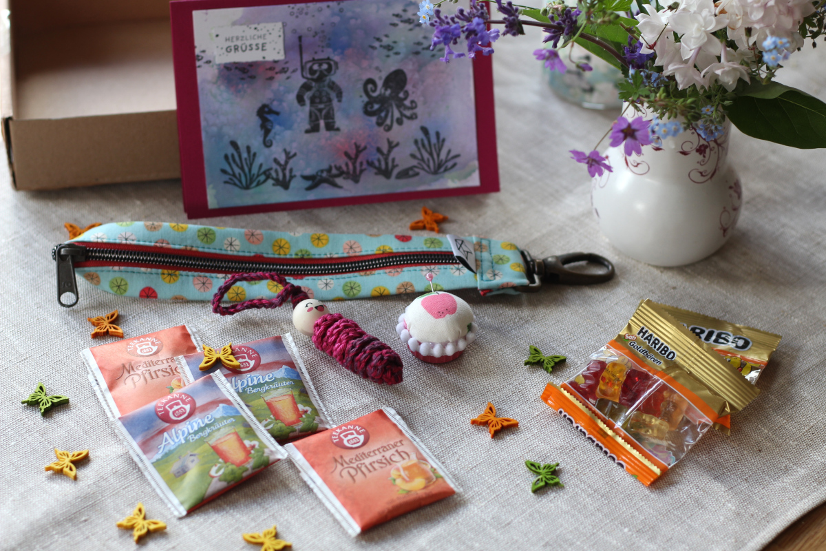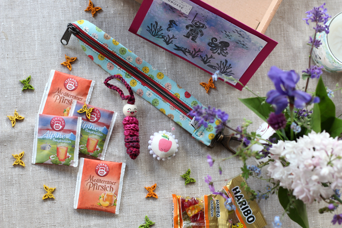 es war mir auch ein großes Vergnügen, das du mit dabei warst :0) Das hat dich ja vor Herausforderungen gestellt, die du fabelhaft gemeistert hast! Das Täschchen ist ganz zauberhaft, ganz toll unbunt und genau Nicoles Stil :0) Die Anhänger sehen auch klasse aus, bei Makramee muss ich tatsächlich passen…Dein Paket von Rike hat es mir angetan, wie süß- ein Würmchen, das macht doch gleich gute Laune! Und der Oberhammer ist das Mini-Nadelkissen, hachz! Ich liebe witzige Nadelkissen!!! Dazu noch Gummibärchen, Tee und die wunderschön selbst gestempelte Karte, wow! Ein Jackenhalter? Das hab ich noch nie gehört, man lernt nicht aus, wie praktisch! Undine, hab herzlichen Dank fürs mitmachen und lesen meines Blogs, auch bei Instagram bist du da immer mit dabei, wie schön! Ganz LG aus Dänemark, Ulrike :0)