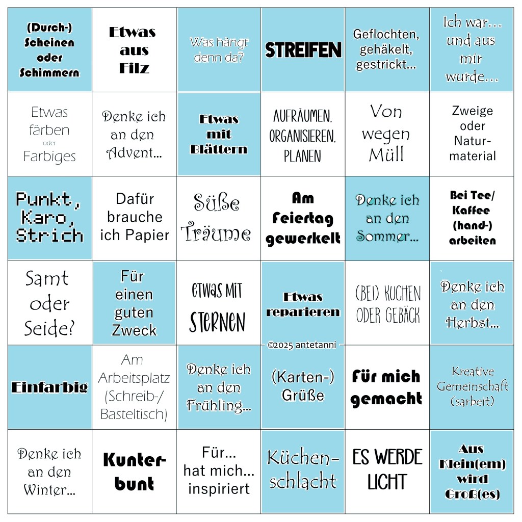 Viel Spaß beim Ausprobieren – und lasst euch den Herbst schmecken! Apropos Herbst, an denke ich bei diesem deftigen Essen und kreuze bei Antetannis Jahresbingo das entsprechende Feld an. Ich habe wirklich meine Felder so geschickt angekreuzt, dass ich auch im Oktober noch nicht ein Bingo habe. Na ja, noch ist das Jahr nicht zu Ende. Da geht noch was.