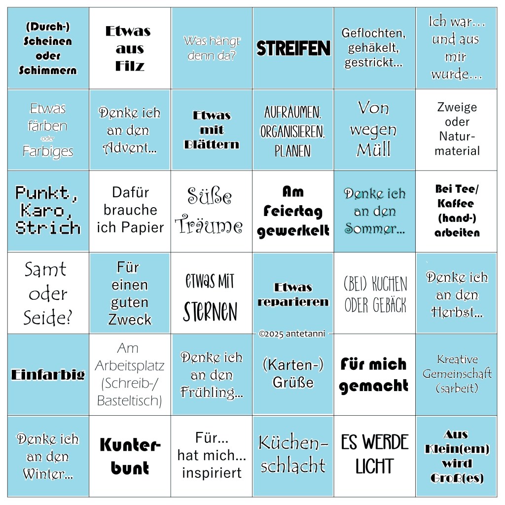 Denk ich an den Advent, denke ich an den nachhaltigen Adventskalender und damit kreuze ich noch ein Feld bei Antetannis Jahresbingo an.