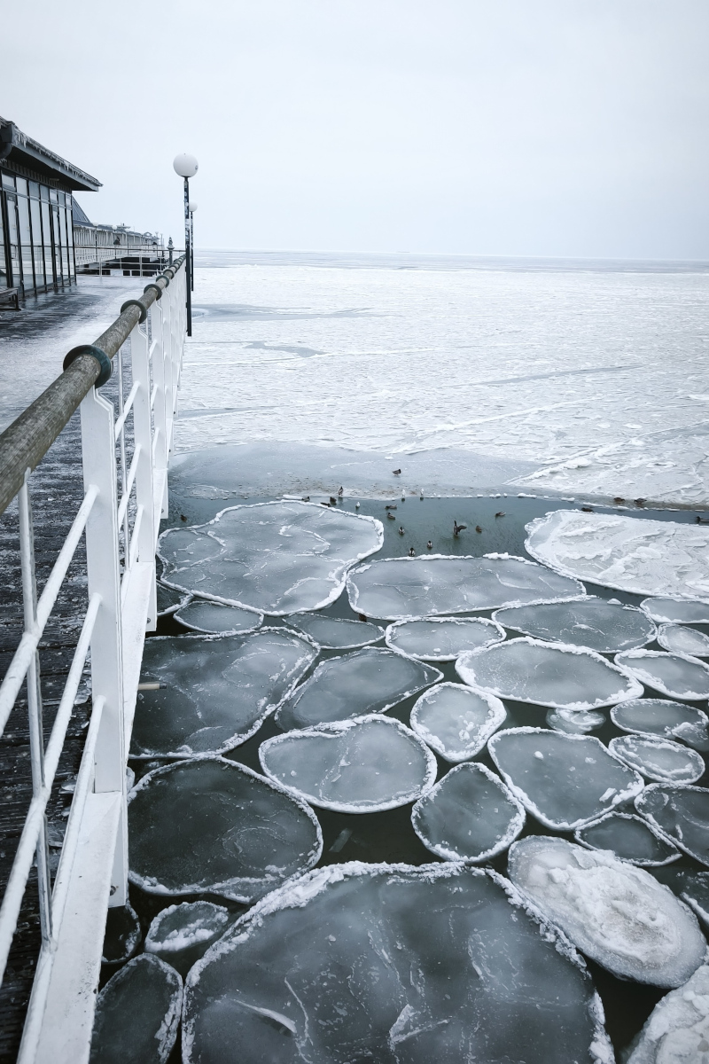Leider brachte die Eiswüste auch ihre Tücken mit sich. Der Strand war komplett überfroren, spiegelglatt und nicht begehbar. Also blieb es bei ein paar eindrucksvollen Fotos, bevor wir uns vorsichtig wieder zurückzogen. Da wir noch kein Mittagessen hatten, landeten wir schließlich in Heringsdorf in einem Café. Und was soll ich sagen – wenn man schon im Urlaub ist, darf zum Kaffee auch ein ordentliches Stück Kuchen nicht fehlen.