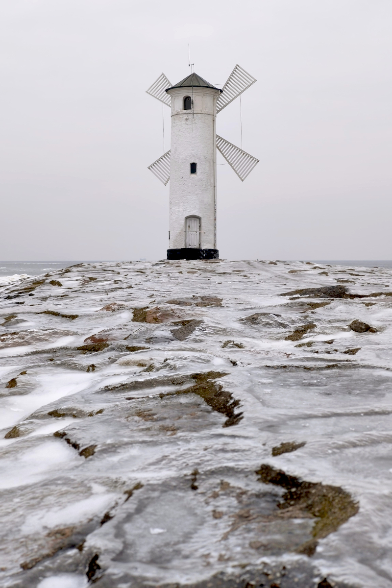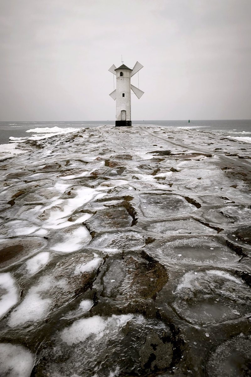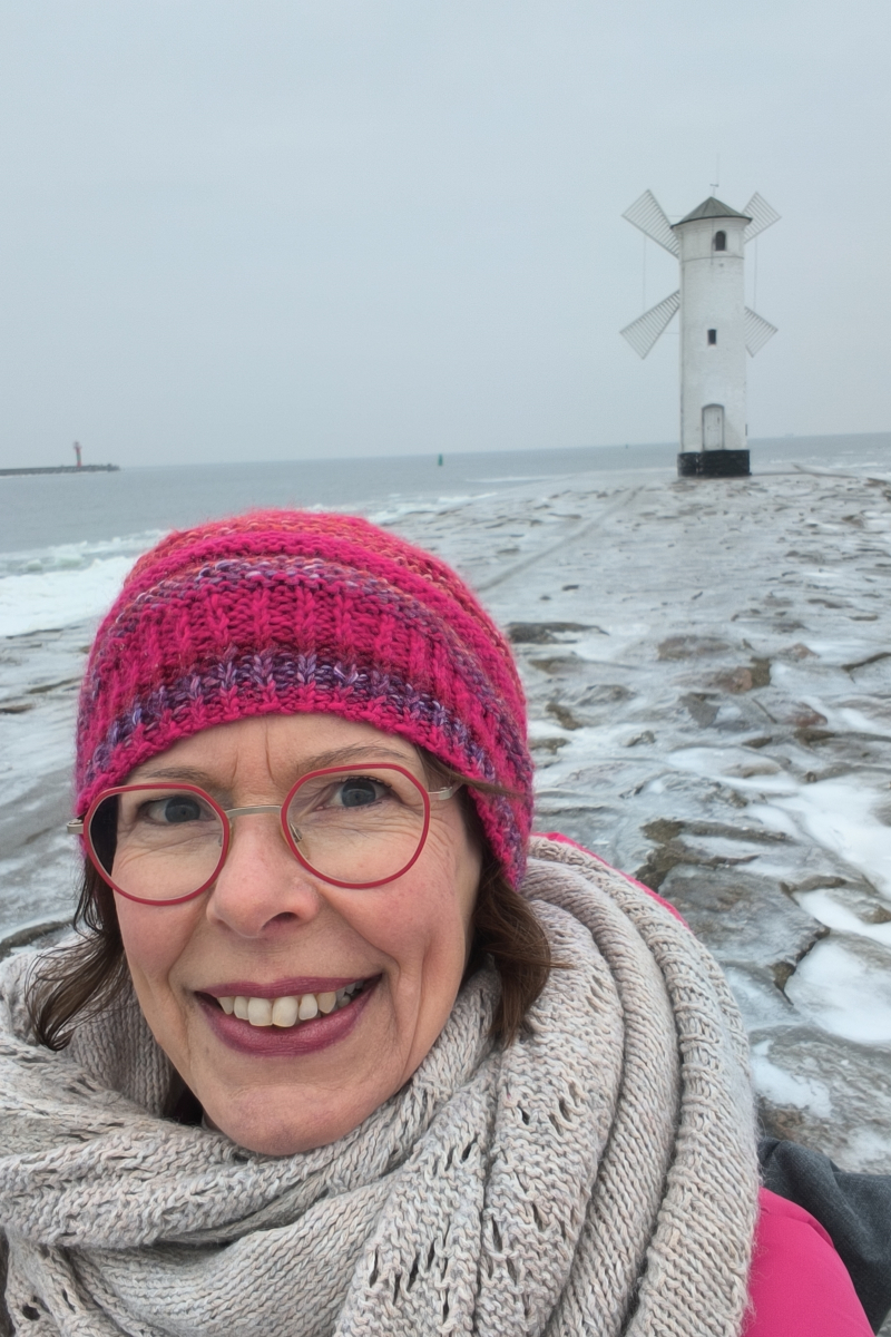 Am letzten Tag fuhren wir mit dem Auto nach Swinemünde. Eigentlich wären wir gern wie im letzten Jahr gelaufen, aber angesichts der ungeräumten Wege war uns das zu riskant. Unser Ziel war die Mühlenbake am Strand – das rot-weiße Seezeichen aus dem 19. Jahrhundert, das die Einfahrt zum Hafen markiert und eines der Wahrzeichen der Stadt ist. Ich kämpfte mich über spiegelglatte Wege bis dorthin vor, um ein paar zugegebenermaßen spektakuläre Fotos zu machen, aber es war so sauglatt, dass ich ständig Angst hatte, auf meinen Hintern zu fallen. Also trat ich nach einigen Aufnahmen lieber den Rückzug an. Damit du siehst, dass ich nicht den Farbfilm vergessen habe, gibts ein buntes Selfie von mir, eingemummelt in eine pinke Daunenjacke, Raupenmütze und meinen geliebten Kyler-Schal.